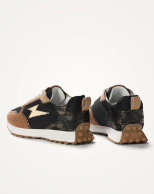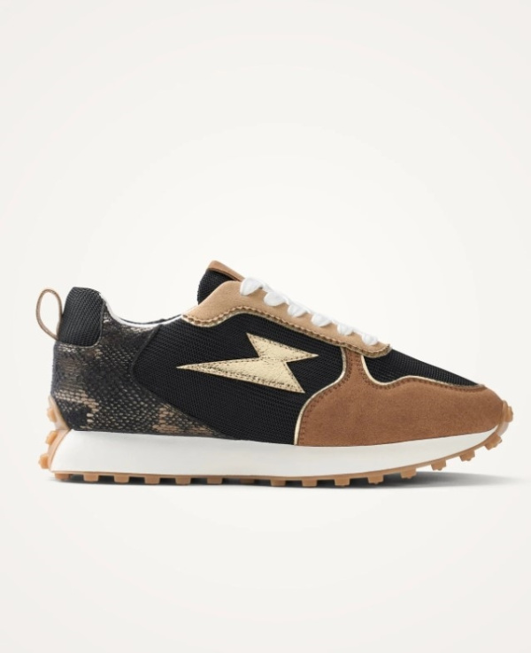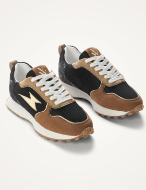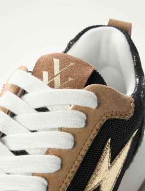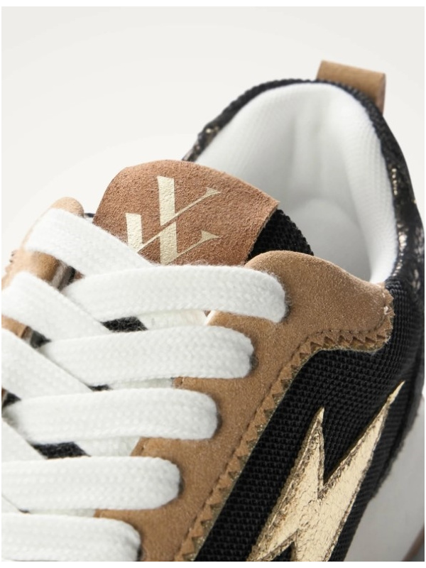 Ces baskets basses Vanessa Wu en toile de sergé beige combinent style et audace grâce à leurs éléments raffinés. La découpe en forme d'éclair et les liserés en similicuir texturé or apportent une touche de brillance sophistiquée. Les garants en tissu à paillettes orange, or, rose et bronze ajoutent une dimension scintillante, tandis que le contrefort en suédine beige à imprimé guépard or effet miroir crée un contraste saisissant et unique.
