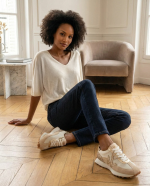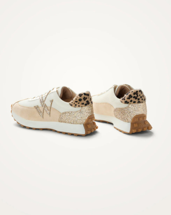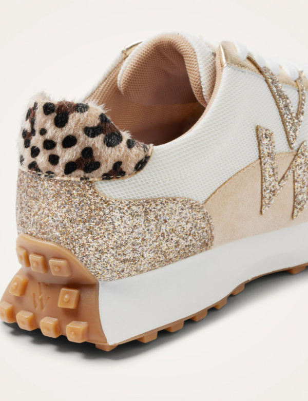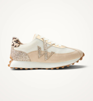 Baskets à l’esthétique urbaine et raffinée, pensées pour apporter une touche mode à une silhouette casual. Le jeu de matières crée un équilibre subtil entre esprit sport et finitions précieuses, avec des détails pailletés et un accent léopard signature. La semelle structurée assure confort et stabilité au quotidien.