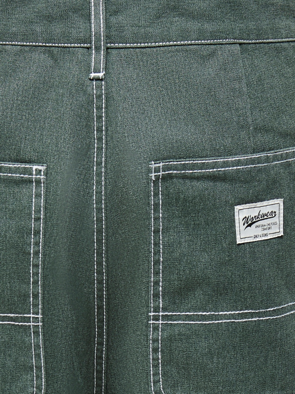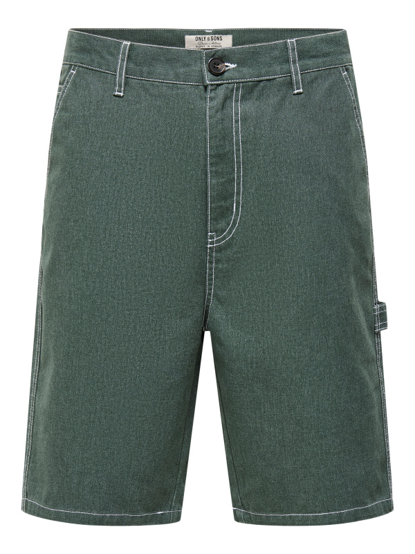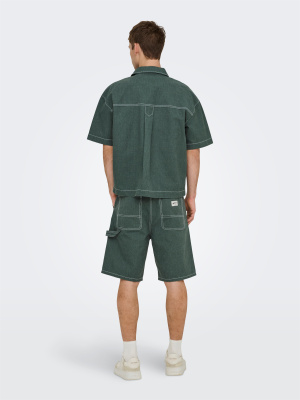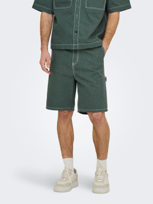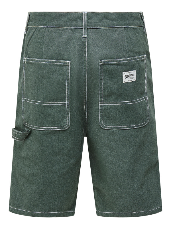 Bermuda en denim vert profond au style workwear revisité, souligné par de jolis contrastes de surpiqûres.