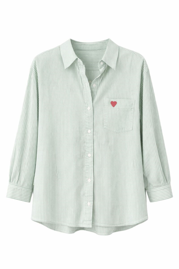 Le détail qui fait toute la différence : un cœur brodé à la poitrine, délicat et subtil, qui apporte une touche féminine et moderne. Sa patte de boutonnage classique et ses manches longues en font une pièce facile à porter, aussi bien rentrée dans un pantalon qu’en version plus décontractée.