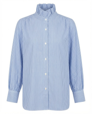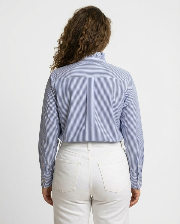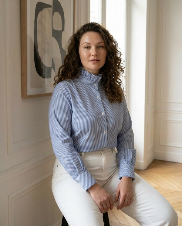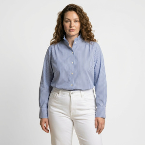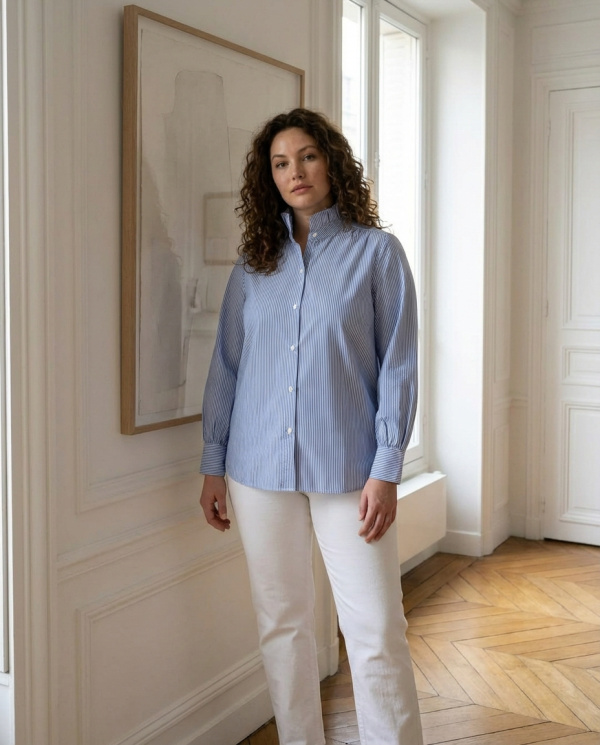 Le motif à rayures fines ainsi que son col montant froncé apportent une touche de modernité et d’élégance, idéale aussi bien pour une tenue de bureau que pour un look chic. Confectionnée dans une matière douce et respirante, cette chemise assure confort et style tout au long de la journée.