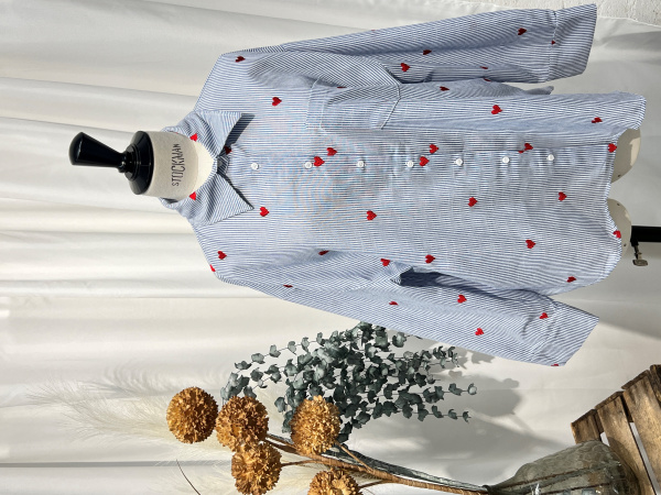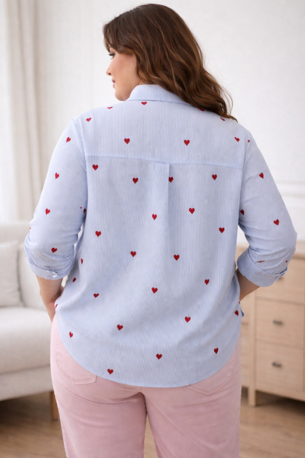 Succombez au charme délicat de cette chemise à rayures fines, rehaussée de petits cœurs brodés sur l’ensemble du tissu. Conçue pour la gamme grande taille, elle associe élégance, confort et féminité au quotidien.