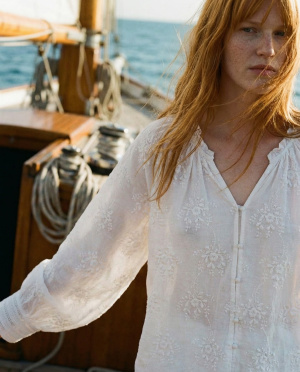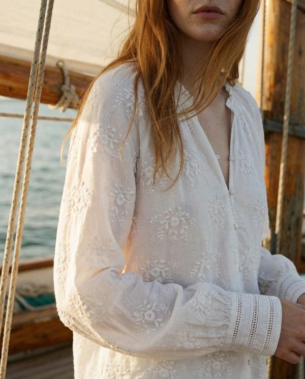Le tissu est entièrement travaillé en broderie ton sur ton, créant un jeu de relief subtil et raffiné. L’encolure légèrement ouverte, soulignée de petits boutons, apporte une touche féminine et délicate. Les manches longues, resserrées aux poignets avec finitions texturées, structurent l’ensemble tout en conservant de la douceur.