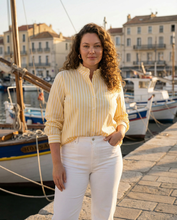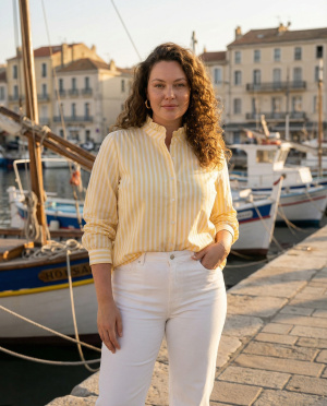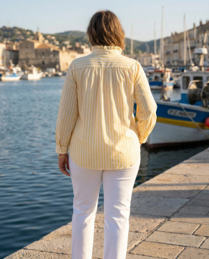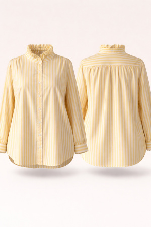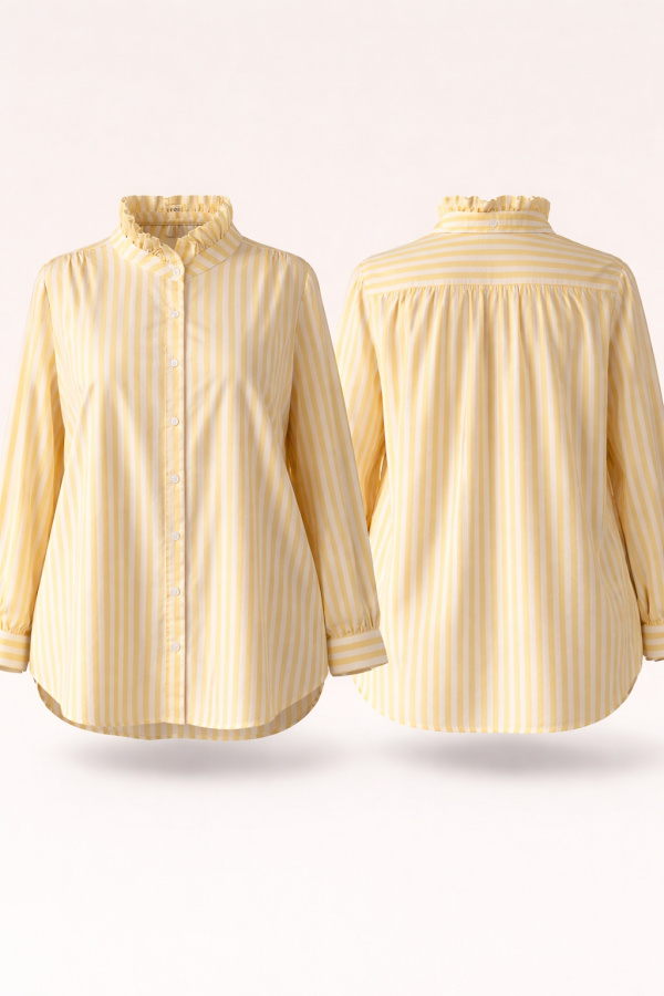 Le motif à rayures fines ainsi que son col montant froncé apportent une touche de modernité et d’élégance, idéale aussi bien pour une tenue de bureau que pour un look chic. Confectionnée dans une matière douce et respirante, cette chemise assure confort et style tout au long de la journée.