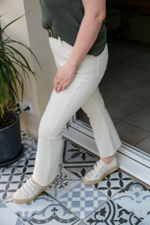 Le pantalon cropped flare est une pièce tendance qui combine deux éléments de style : la coupe flare et une longueur courte. Ce pantalon est ajusté au niveau des hanches et des cuisses, puis s’élargit doucement à partir du genou, créant une forme évasée. Ce qui le distingue particulièrement, c’est sa longueur, qui s’arrête juste au-dessus de la cheville, offrant un effet "cropped" ou raccourci.