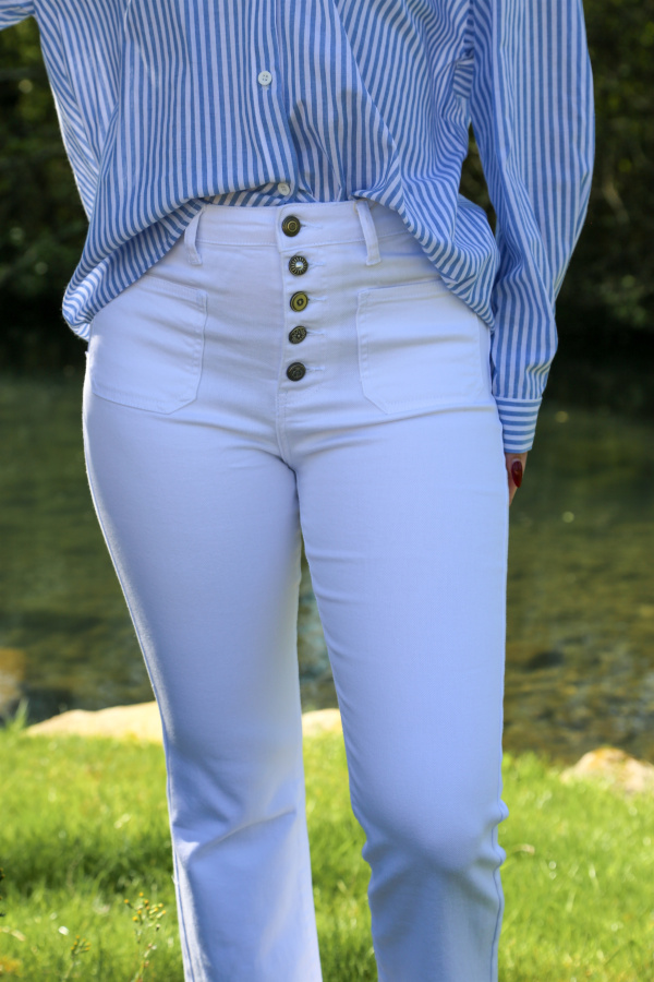 Adoptez un look vintage et tendance avec ce pantalon coupe flare. Sa braguette à boutons décoratifs apparents ajoute une touche d'originalité et de caractère, tandis que les poches plaquées à l'avant apportent un côté pratique et stylé. La coupe flare crée une silhouette flatteuse, parfait pour allonger les jambes et apporter une touche d'élégance à votre look.