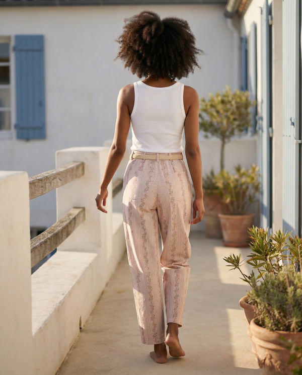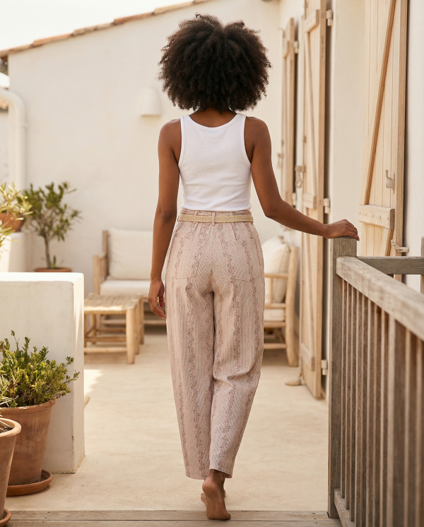 Le tissu présente un motif vertical finement travaillé, composé de rayures et de détails ornementaux répétés, créant un effet allongeant visuellement la jambe. La matière semble légère avec un tombé souple, adaptée à une allure estivale.