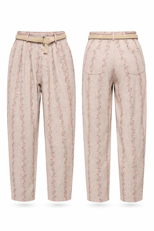 Pantalon à coupe droite et légèrement ample, offrant une silhouette fluide et confortable. La taille est haute, structurée par une ceinture intégrée avec passants, accompagnée d’une ceinture tressée qui souligne la ligne de taille et apporte une touche texturée.