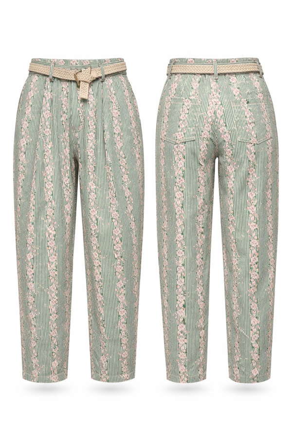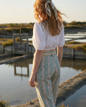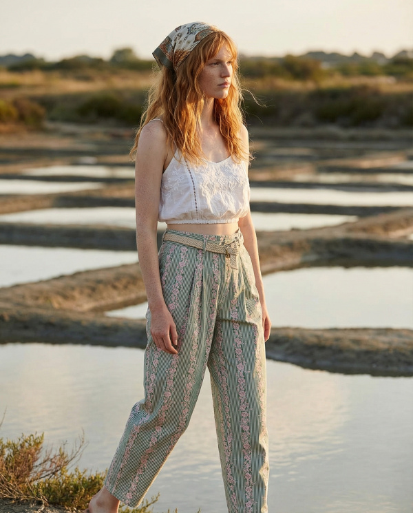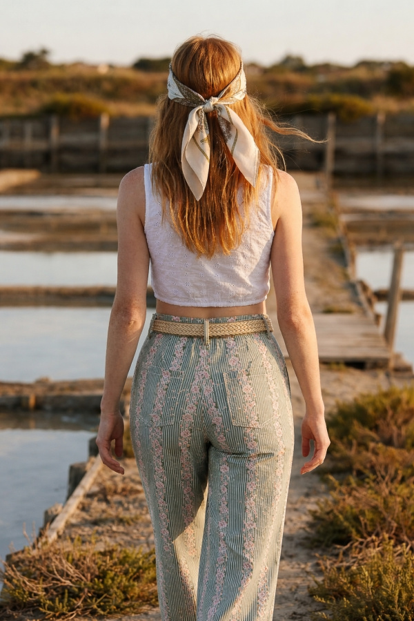 Le tissu présente un motif vertical finement travaillé, composé de rayures et de détails ornementaux répétés, créant un effet allongeant visuellement la jambe. La matière semble légère avec un tombé souple, adaptée à une allure estivale.