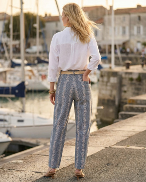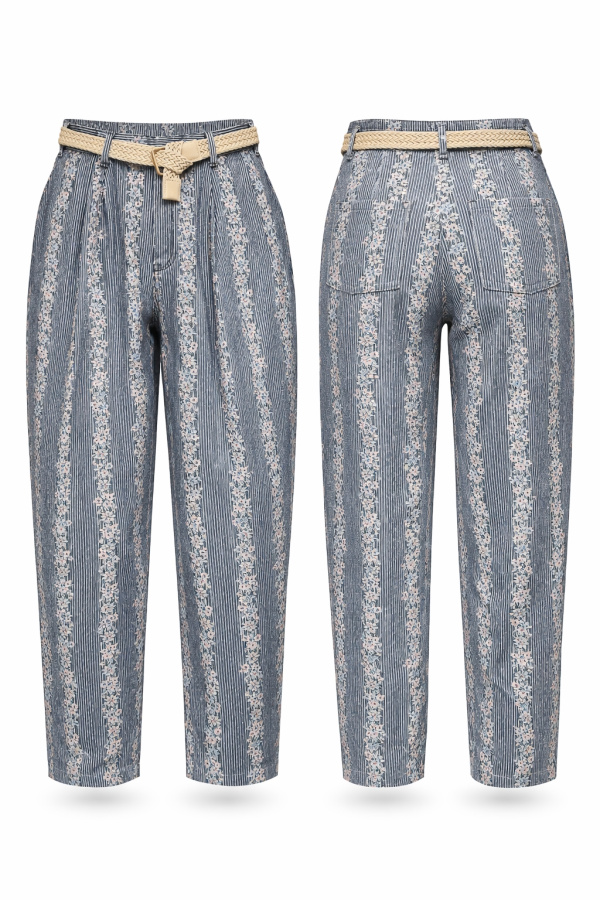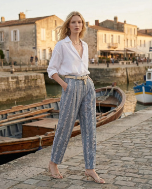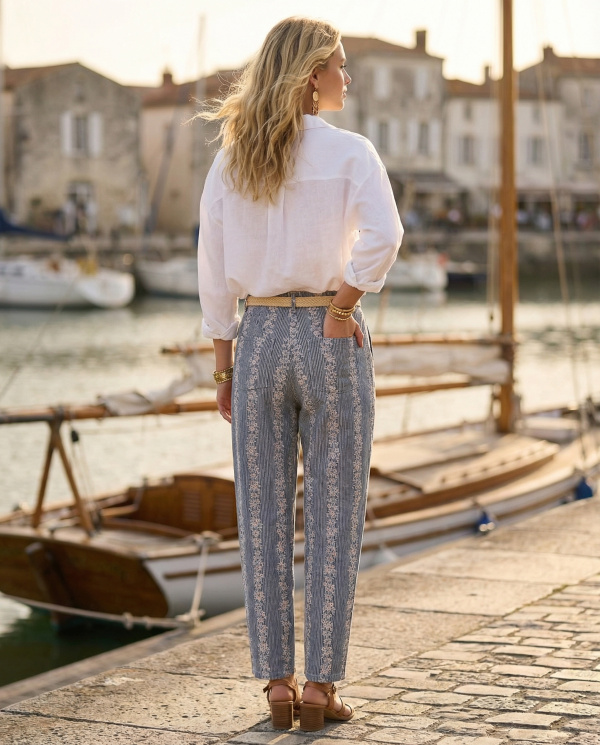 Le tissu présente un motif vertical finement travaillé, composé de rayures et de détails ornementaux répétés, créant un effet allongeant visuellement la jambe. La matière semble légère avec un tombé souple, adaptée à une allure estivale.