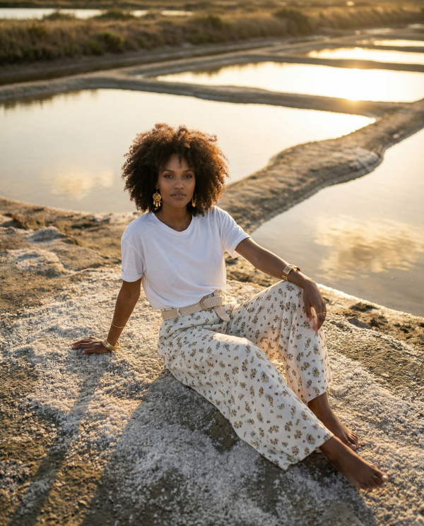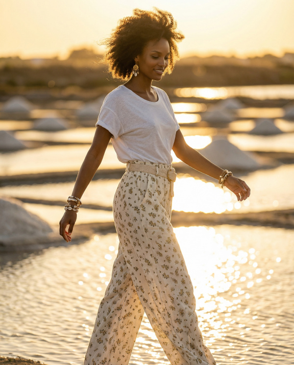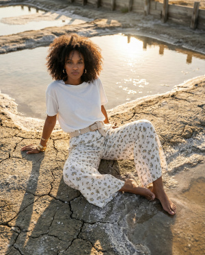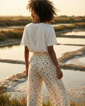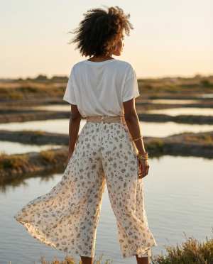 Ce pantalon s’inscrit dans une esthétique bohème chic, idéale pour un vestiaire estival, combinant élégance naturelle et facilité de port.