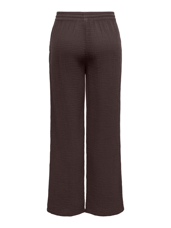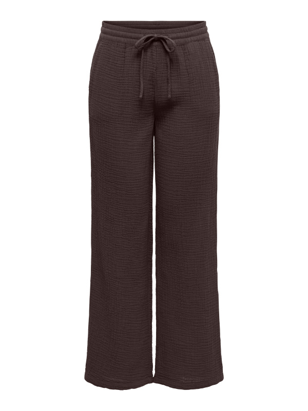 Taille élastiquée avec lien à nouer, coupe large et matière gaufrée ultra légère : il mise tout sur le confort sans oublier l’allure.