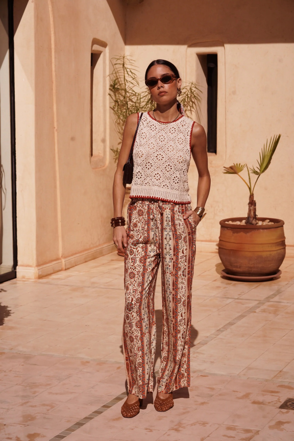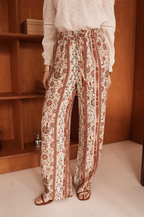Pantalon large à la coupe fluide, confectionné dans une matière légère et aérienne, idéale pour les journées ensoleillées. Sa base beige lumineuse est rehaussée d’un imprimé délicat aux accents terracotta et motifs floraux, apportant une touche artisanale et chaleureuse.