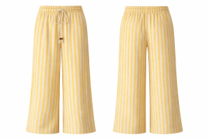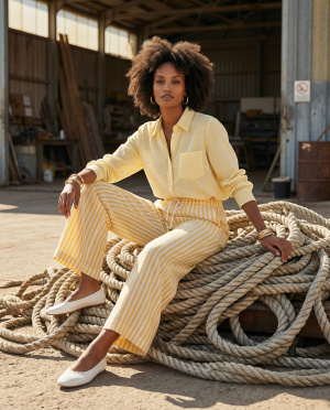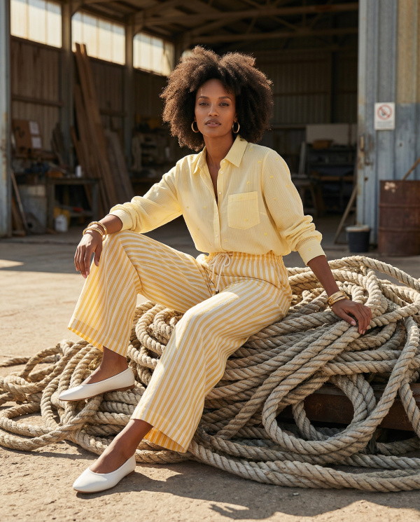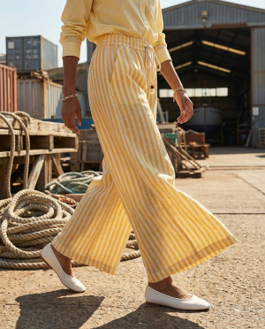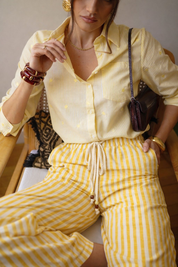 Pantalon à rayures verticales délavé, à l’allure naturelle et estivale. Sa coupe droite légèrement ample allonge la silhouette tout en offrant un confort absolu. La taille élastiquée avec lien de serrage tressé apporte une touche artisanale et décontractée, soulignée par de petits détails en perles boisées. Un essentiel facile à porter, pensé pour un vestiaire chic et solaire.