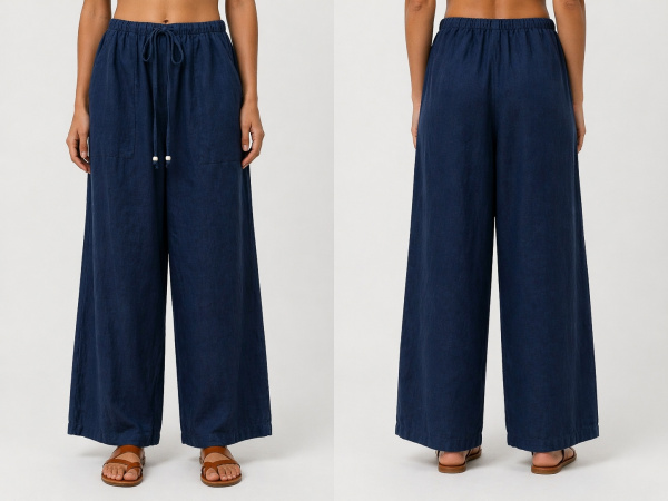 Pantalon en 100% lin, conçu pour une silhouette fluide et naturelle. Sa taille élastiquée avec lien de serrage apporte confort et ajustement, tandis que la coupe large allonge la ligne avec légèreté. Le lin, respirant et légèrement texturé, offre un tombé souple idéal pour la saison estivale.