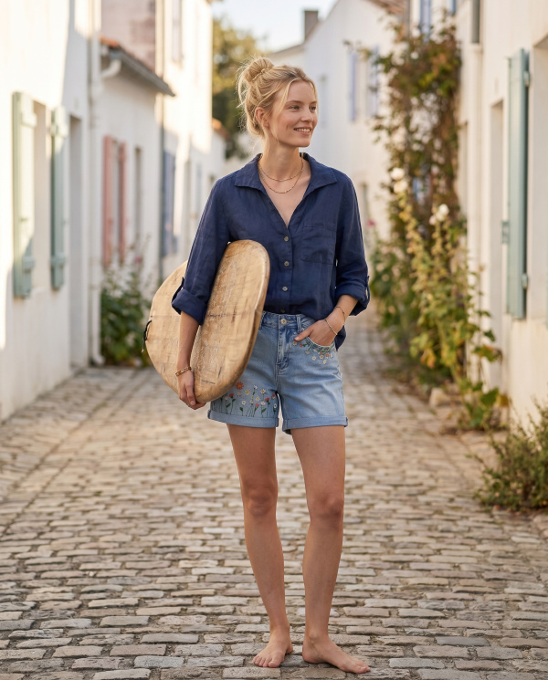 Short en denim clair à l’allure casual maîtrisée, enrichi de broderies florales multicolores qui apportent relief et fraîcheur. La coupe, légèrement ajustée avec ourlets retroussés, structure la silhouette tout en conservant un esprit décontracté.