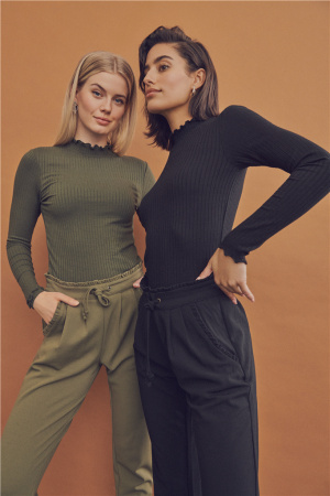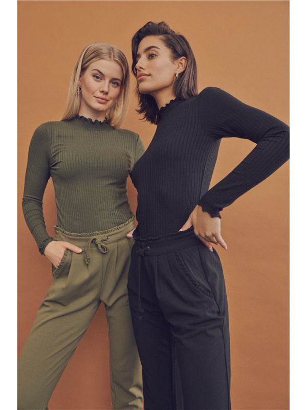 Ce pull fin côtelé dévoile une allure délicate et féminine grâce à sa maille souple et agréable à porter, ses manches longues apportent une élégance naturelle tandis que le col montant s’anime de volants subtils qui illuminent la silhouette, les bords également ornés de légers volants ajoutent une touche romantique et raffinée et l’ensemble crée un style doux et distingué idéal pour accompagner toutes vos tenues du quotidien