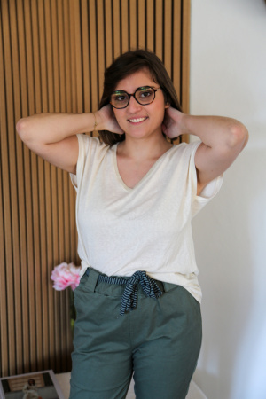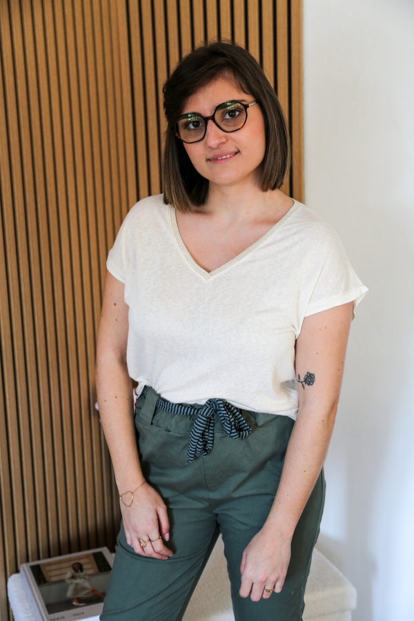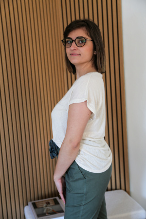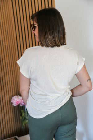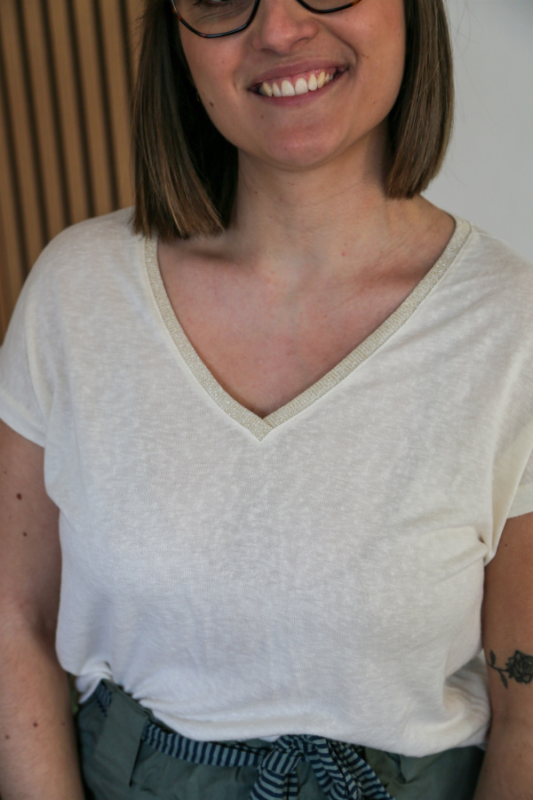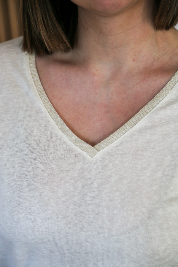 Ce tee-shirt à manches courtes et col en V combine simplicité et touche de brillance grâce à ses fils de lurex subtils, ajoutant une dimension élégante et moderne à une pièce basique. Fabriqué en Italie avec un soin exceptionnel, il offre une coupe confortable et flatteuse. Le col V met en valeur la silhouette, tout en apportant une note de sophistication discrète. Parfait pour être porté en toute occasion, ce tee-shirt se marie aussi bien avec un jean décontracté qu’une jupe plus habillée, offrant une touche de luxe facile à intégrer à votre quotidien.