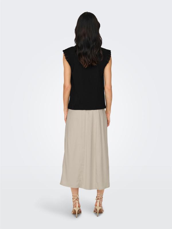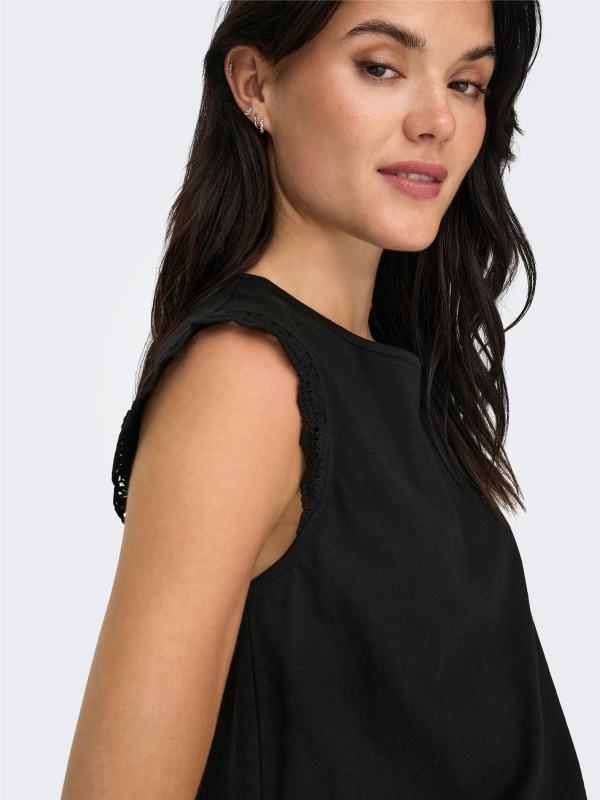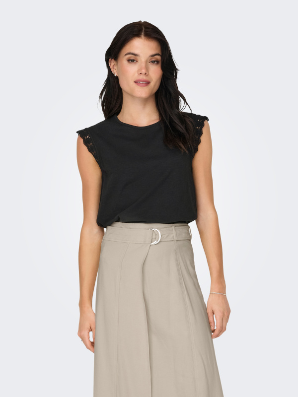 Ce top uni à la coupe regular fit est un essentiel à la fois simple et élégant. Sans manches, il est parfait pour les journées plus chaudes ou pour être superposé sous un gilet ou une veste. Le col rond offre une allure classique, tandis que les détails en dentelle sur les manches ajoutent une touche féminine et raffinée. Ce top versatile se prête à de nombreuses occasions, que ce soit pour une tenue décontractée ou un look plus habillé. Facile à assortir avec vos pantalons ou jupes préférés, il est un incontournable pour un style élégant et moderne.