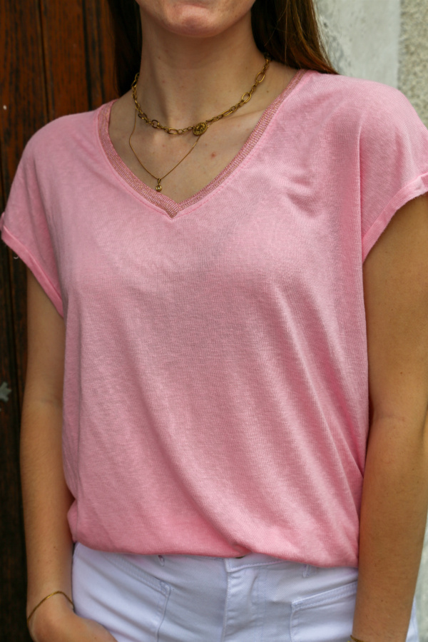 Ce tee-shirt à manches courtes et col en V combine simplicité et touche de brillance grâce à ses fils de lurex subtils, ajoutant une dimension élégante et moderne à une pièce basique. Fabriqué en Italie avec un soin exceptionnel, il offre une coupe confortable et flatteuse. Le col V met en valeur la silhouette, tout en apportant une note de sophistication discrète. Parfait pour être porté en toute occasion, ce tee-shirt se marie aussi bien avec un jean décontracté qu’une jupe plus habillée, offrant une touche de luxe facile à intégrer à votre quotidien.