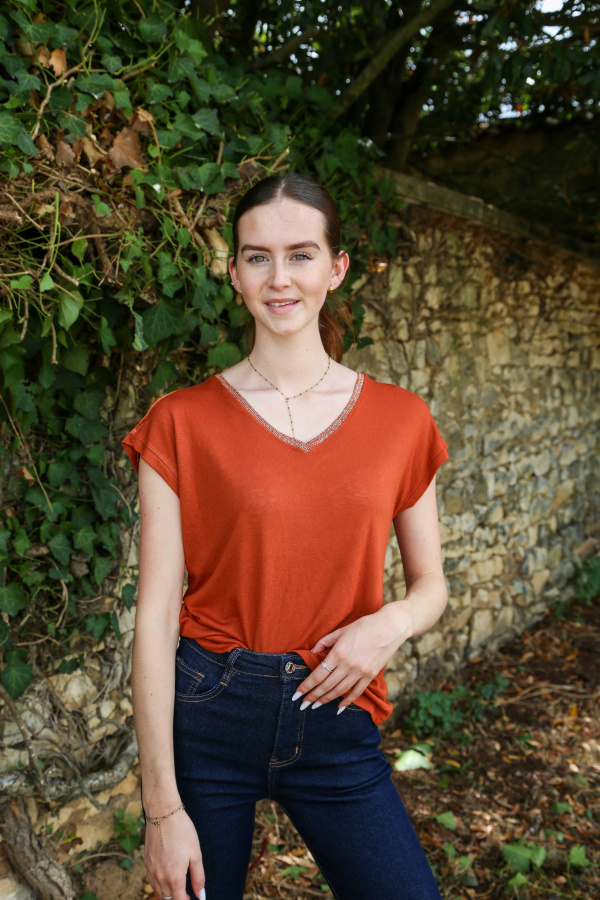 Ce tee-shirt à manches courtes et col en V combine simplicité et touche de brillance grâce à ses fils de lurex subtils, ajoutant une dimension élégante et moderne à une pièce basique. Fabriqué en Italie avec un soin exceptionnel, il offre une coupe confortable et flatteuse. Le col V met en valeur la silhouette, tout en apportant une note de sophistication discrète. Parfait pour être porté en toute occasion, ce tee-shirt se marie aussi bien avec un jean décontracté qu’une jupe plus habillée, offrant une touche de luxe facile à intégrer à votre quotidien.