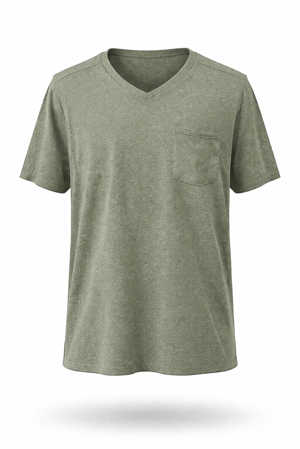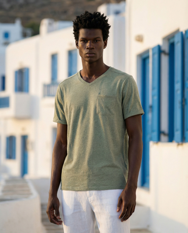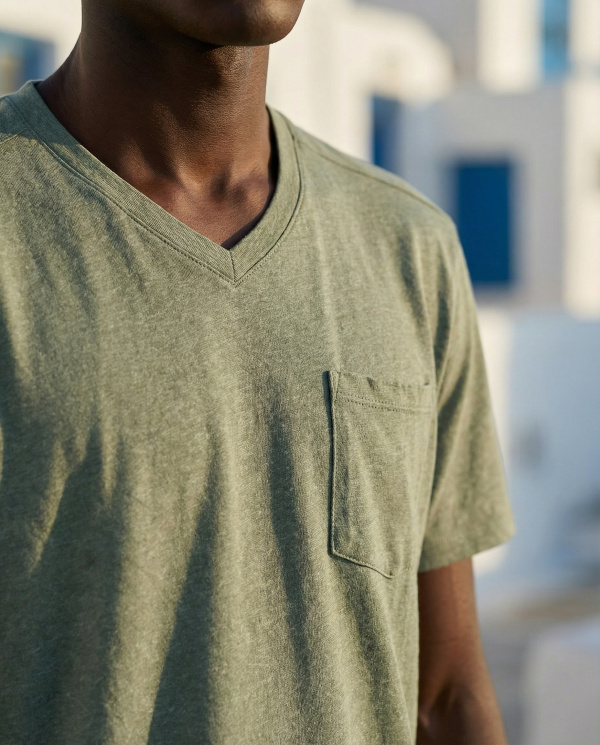Le col V apporte une touche moderne et légèrement sophistiquée, tandis que la poche poitrine discrète structure le design avec subtilité. Sa teinte s’intègre facilement dans un vestiaire masculin casual chic et se combine aisément avec un pantalon chino beige ou un jean brut.