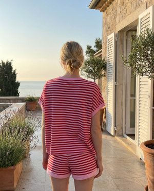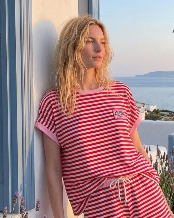 Son motif à rayures rouges et blanches insuffle une énergie estivale, tandis que les finitions en bord-côte rose au col et aux manches apportent une touche contrastée subtile et moderne. Le petit détail patch poitrine renforce son identité casual.