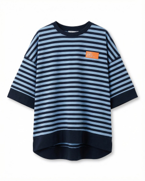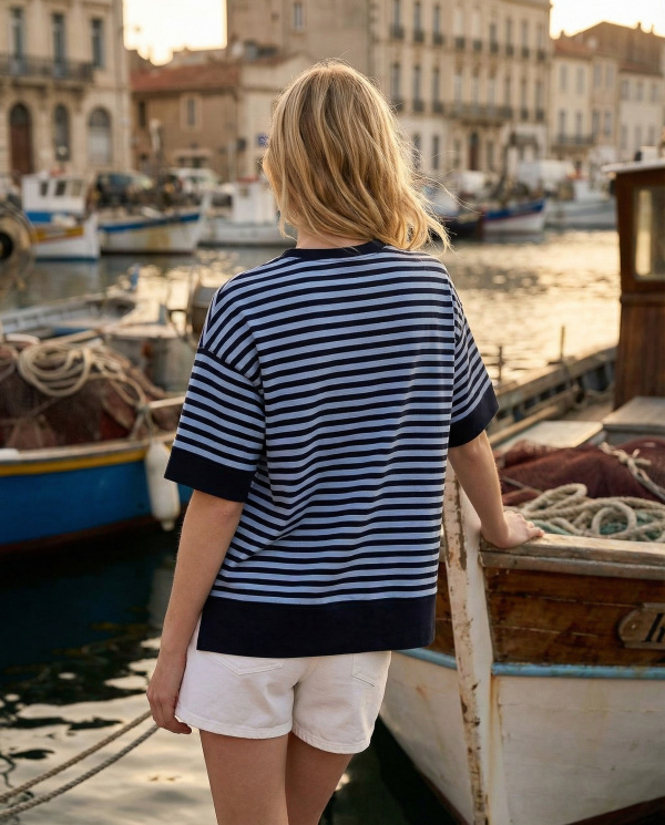 Confectionné en coton à 48%, il offre un bon équilibre entre confort, douceur et tenue. Son motif rayé bleu ciel et marine revisite un classique du vestiaire avec modernité, tandis que les finitions contrastées au col, aux manches et à la base structurent l’ensemble.