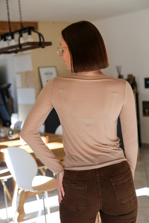 Ce tee-shirt à manches longues séduit par sa matière légère et légèrement transparente, qui dévoile juste ce qu’il faut. Sa coupe près du corps et son col rond classique en font une pièce facile à porter, seule ou superposée.