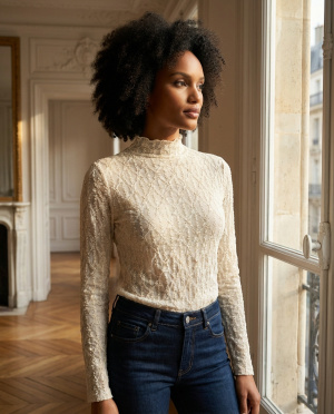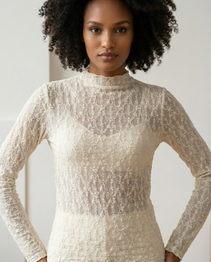 Top élégant à l’esprit féminin et raffiné, confectionné dans une dentelle délicate au motif texturé. Sa coupe ajustée épouse la silhouette avec précision, tandis que le col montant apporte une touche sophistiquée et contemporaine. Les manches longues équilibrent le jeu de transparence pour un rendu chic et maîtrisé.