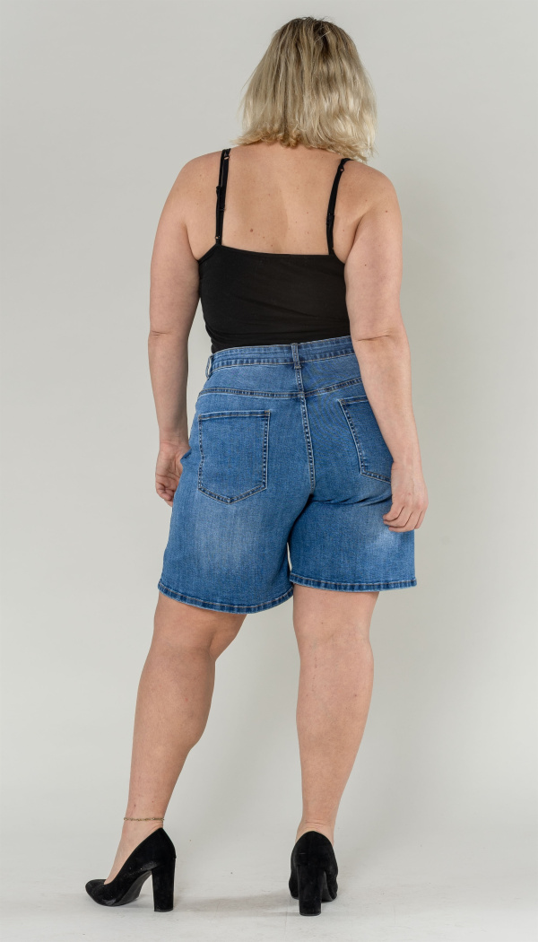 Confectionné en denim souple avec une finition stone wash, il présente un effet subtilement délavé qui apporte du relief tout en restant facile à associer. La taille haute assure un bon maintien et met en valeur la silhouette, tandis que la longueur au-dessus du genou équilibre les proportions.