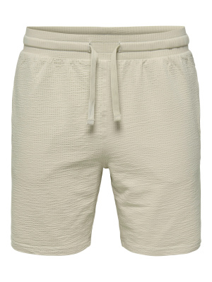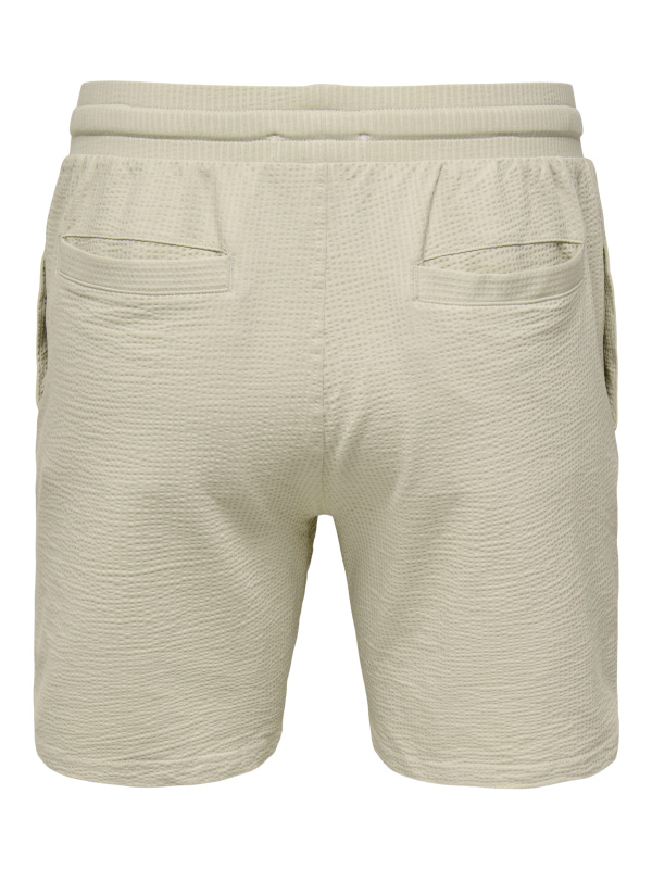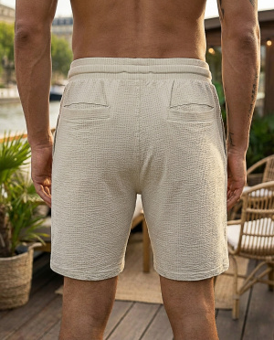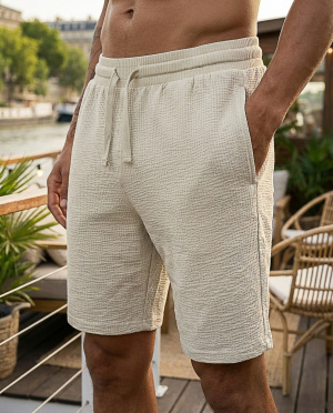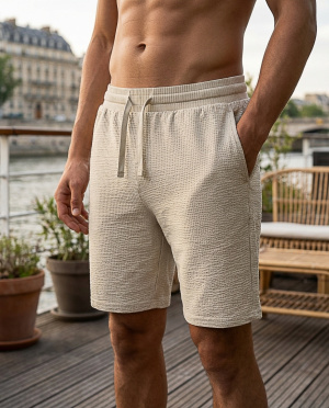 Il présente une coupe confortable au-dessus du genou, avec taille élastiquée et cordon de serrage ajustable pour un maintien optimal. Confectionné en coton avec une texture gaufrée, il offre une sensation naturelle et respirante.