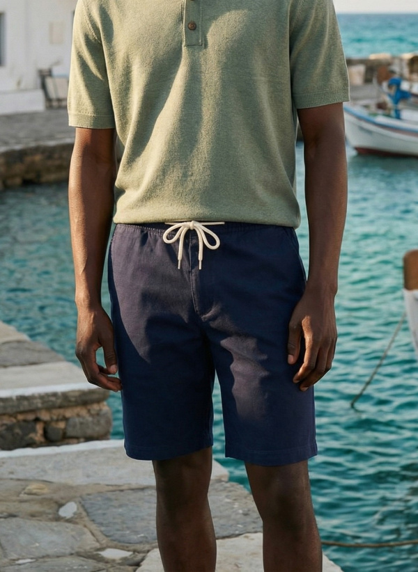 Inspiré d’un vestiaire bord de mer, ce bermuda Benson & Cherry revisite le classique estival avec une exécution moderne et fonctionnelle. Sa teinte bleu marine profonde structure la silhouette et s’intègre facilement dans un dressing casual ou plus habillé.
