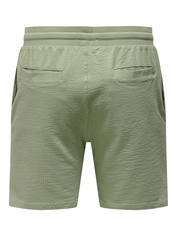 Il présente une coupe confortable au-dessus du genou, avec taille élastiquée et cordon de serrage ajustable pour un maintien optimal. Confectionné en coton avec une texture gaufrée, il offre une sensation naturelle et respirante.