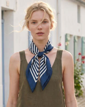 Un foulard au design graphique et structuré, pensé comme une pièce élégante et facile à intégrer dans un vestiaire quotidien. Sa forme carrée permet une multitude de portés : noué autour du cou pour une allure chic, porté dans les cheveux ou attaché à un sac pour une touche plus stylisée.