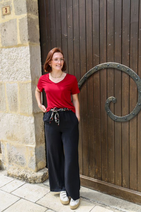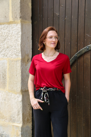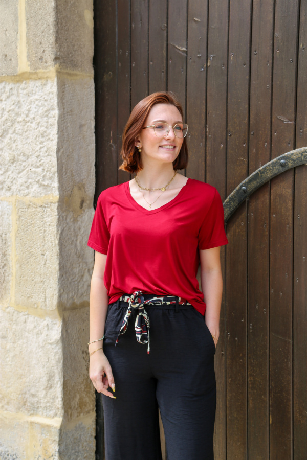 Design : Encolure V classique et manches courtes pour une allure intemporelle et facile à porter.