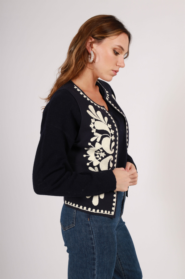 Le boléro se distingue par ses broderies en arabesque, un motif complexe et décoratif inspiré des formes géométriques et florales des arts traditionnels.