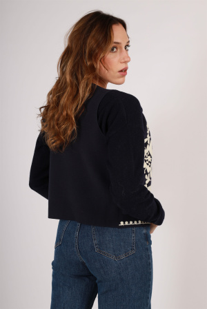 La coupe du boléro est ouverte à l'avant, sans fermeture, ce qui permet de l'enfiler facilement et de le superposer élégamment sur différents types de vêtements.
