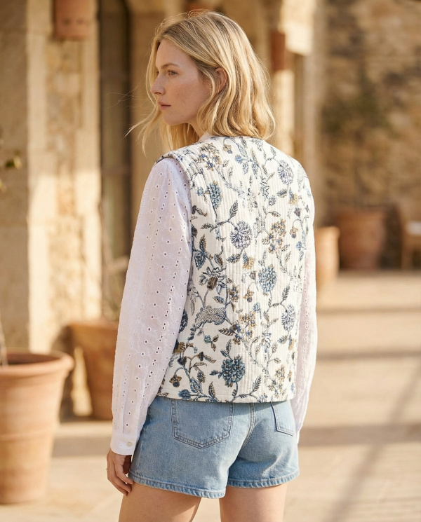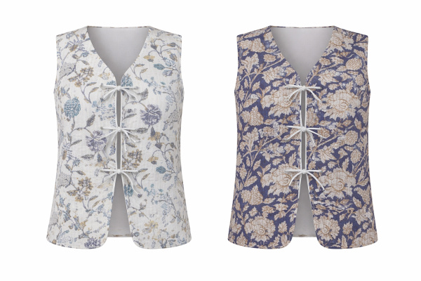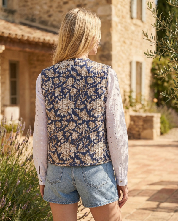 Confectionné dans une matière douce et légère, il se porte des deux côtés : une face claire aux motifs floraux subtils pour une allure lumineuse et raffinée, et une face plus contrastée aux tonalités bleu profond pour un rendu plus affirmé. Le laçage à nouer sur le devant souligne l’esprit artisanal et permet un ajustement souple.