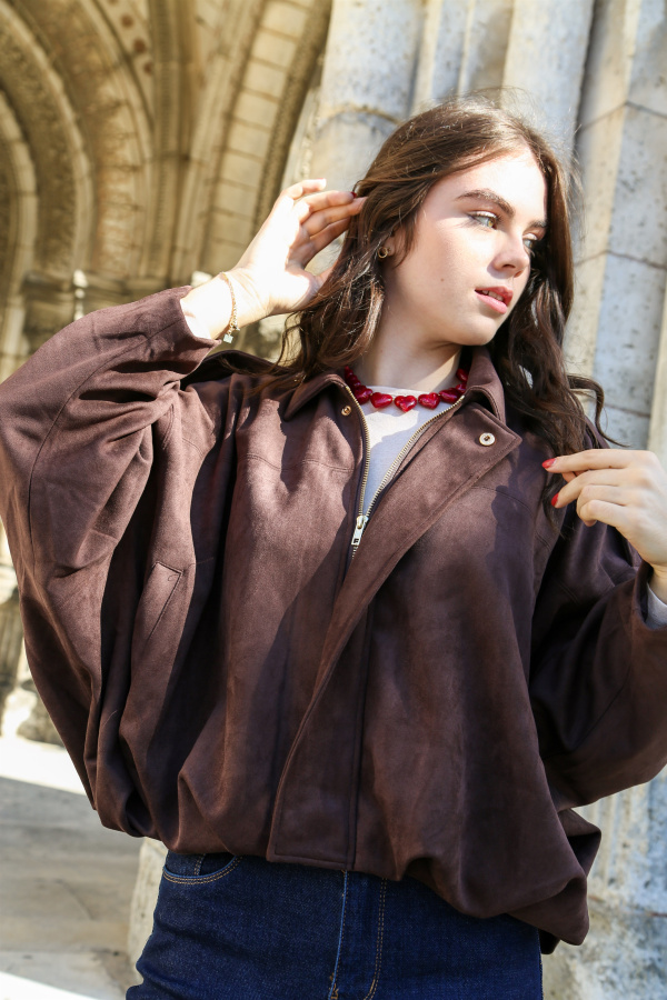 Allure urbaine et toucher doux s'allient dans ce bomber en suédine, parfait pour les looks de mi-saison. Sa fermeture zippée sur le devant et son col plat lui donnent une silhouette épurée et moderne. Facile à associer, il apporte une touche chic-décontractée à toutes vos tenues.