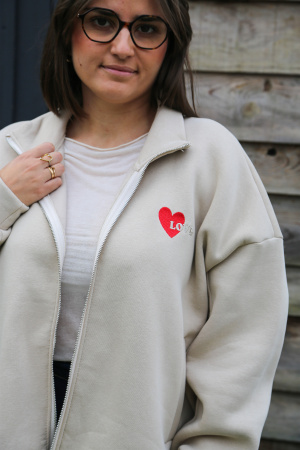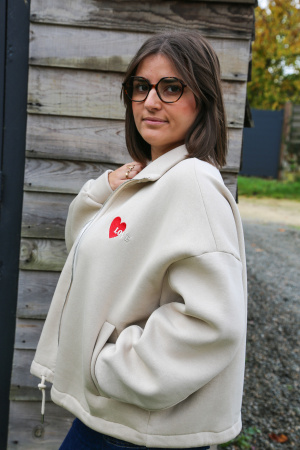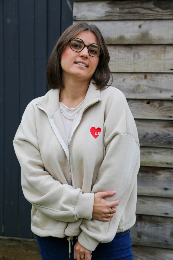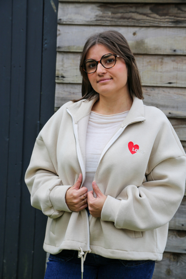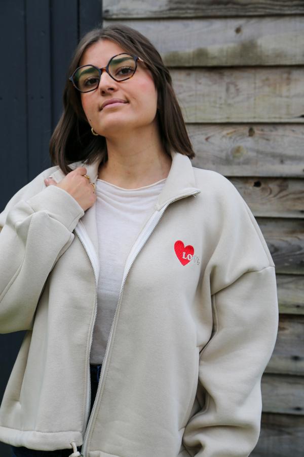 Le cœur brodé avec l’inscription “LOVE” apporte une touche délicate et féminine, tandis que le col haut et la fermeture zippée ajoutent une note moderne et pratique. Les poches latérales complètent le tout pour un look aussi cosy que tendance.