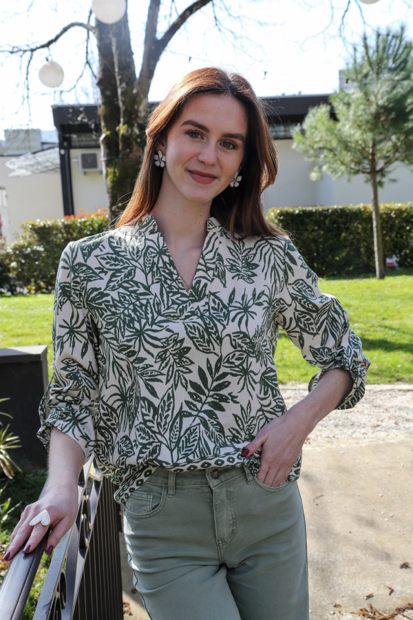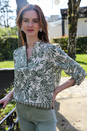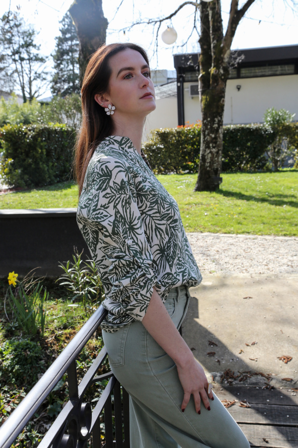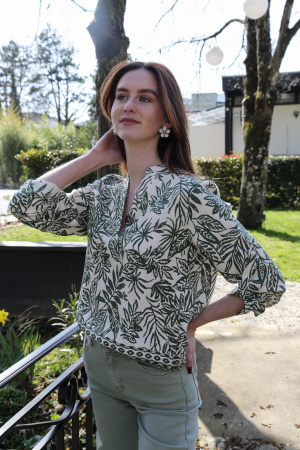 Que ce soit pour une sortie décontractée ou une occasion plus habillée, cette blouse à motif feuillage s’adapte à toutes vos envies.