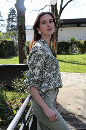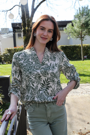 Cette blouse élégante et intemporelle arbore un motif feuillage raffiné, parfait pour apporter une touche de fraîcheur à votre garde-robe. Confectionnée avec soin, elle se distingue par ses manches longues et son col en V qui sublime la silhouette tout en offrant un confort optimal.