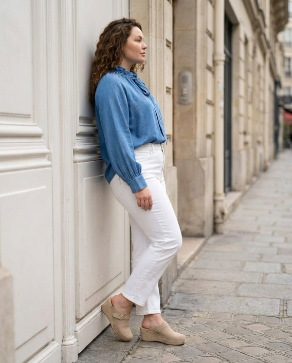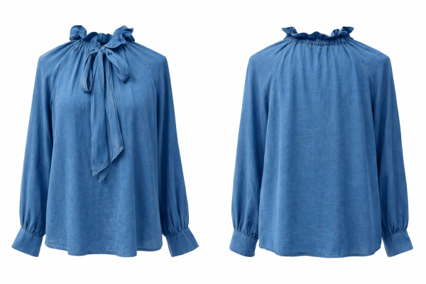 Cette blouse en bleu denim revisite l’esprit romantique avec un col volanté prolongé par une lavallière à nouer. Le tombé est fluide, la matière légère accompagne naturellement les mouvements.