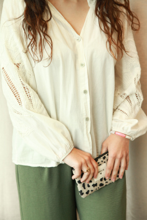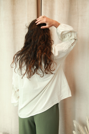 Les manches bouffantes, volumineuses et élégantes, ajoutent du caractère et du mouvement à la chemise, tout en créant une silhouette flatteuse et audacieuse. Les motifs ajourés délicats ornent les manches, offrant une subtile transparence qui apporte légèreté et une touche de sensualité à l'ensemble.