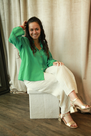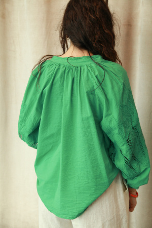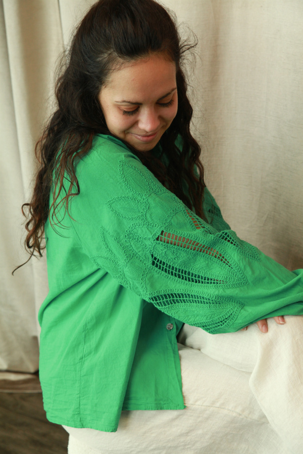 Les manches bouffantes, volumineuses et élégantes, ajoutent du caractère et du mouvement à la chemise, tout en créant une silhouette flatteuse et audacieuse. Les motifs ajourés délicats ornent les manches, offrant une subtile transparence qui apporte légèreté et une touche de sensualité à l'ensemble.