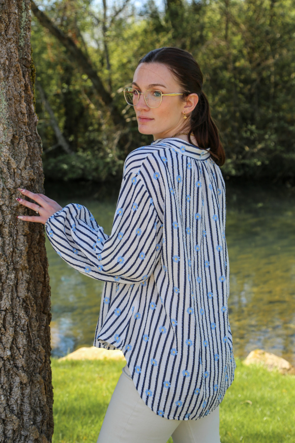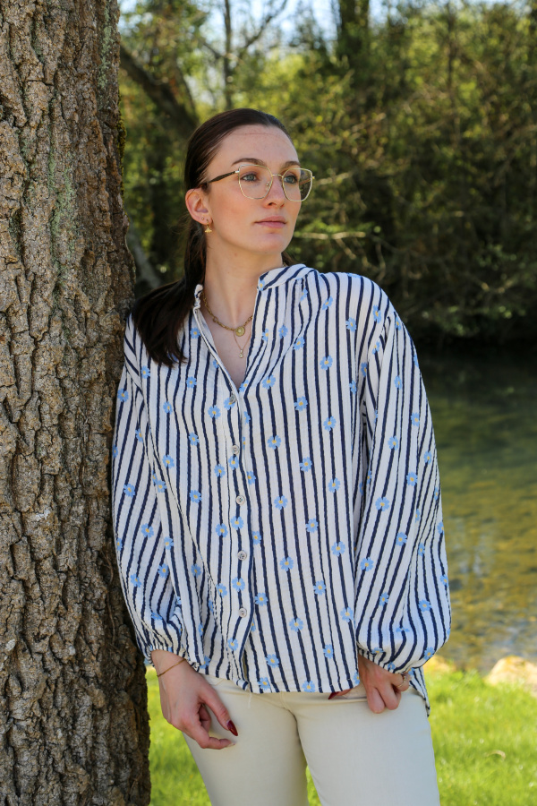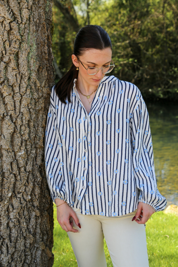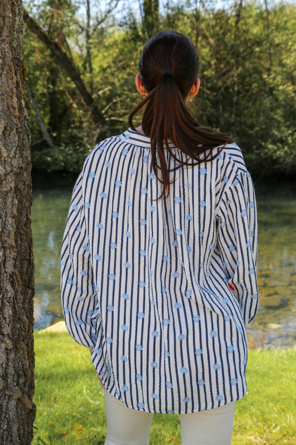 Douce, légère et pleine de charme, cette chemise en gaze de coton combine confort et féminité avec élégance. Son motif à rayures rehaussé de petites fleurettes apporte une touche fraîche et romantique, parfaite pour la belle saison.