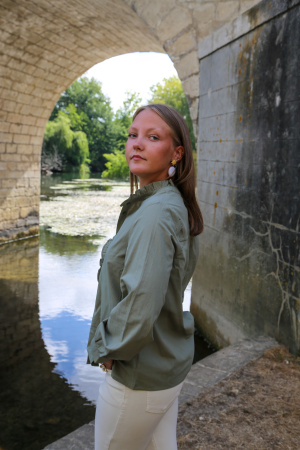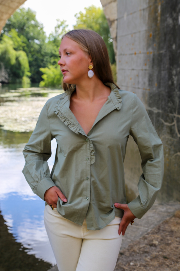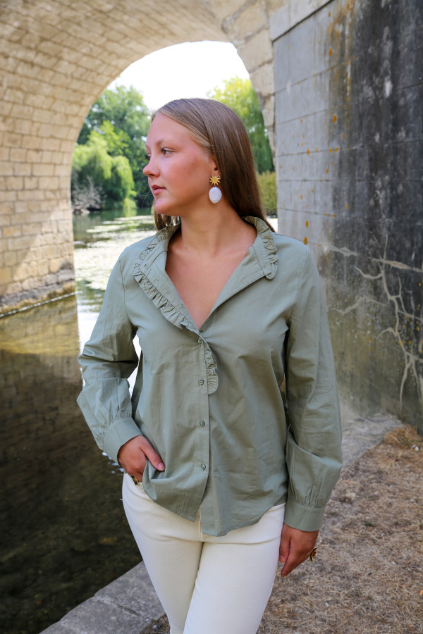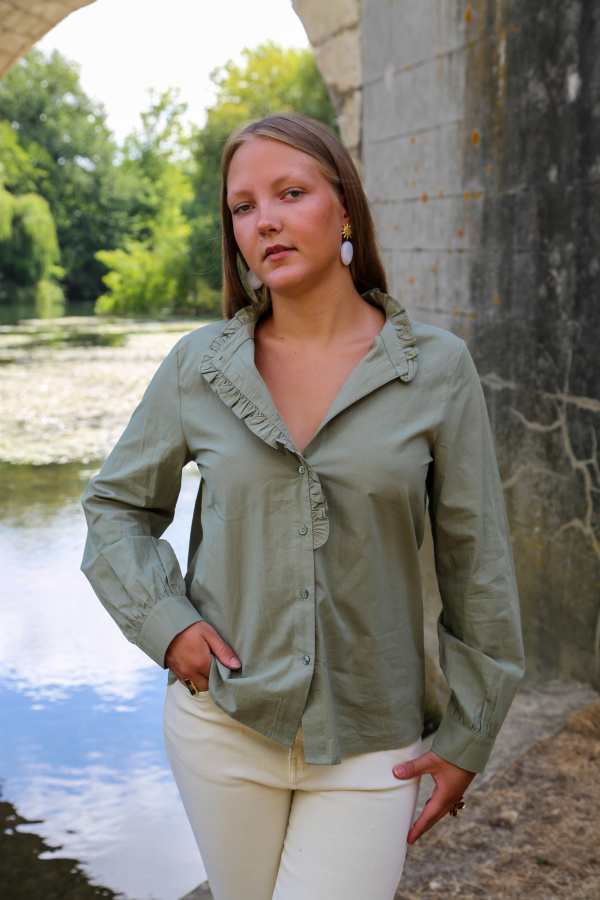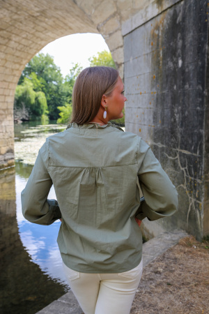 Ce chemisier incarne la simplicité raffinée, avec un clin d'œil à la mode rétro. Facile à associer avec un jean, une jupe ou un pantalon, il devient une pièce polyvalente qui ajoute instantanément du charme à vos tenues quotidiennes.