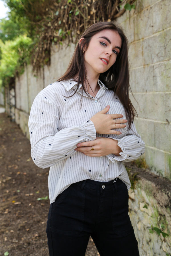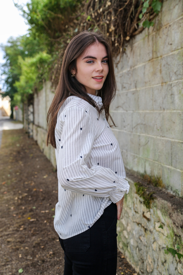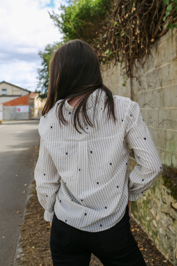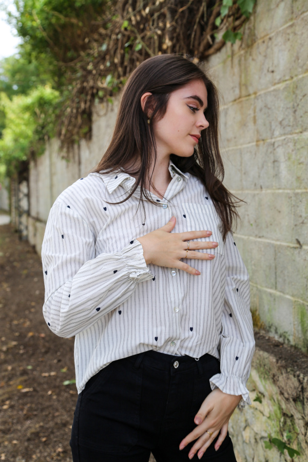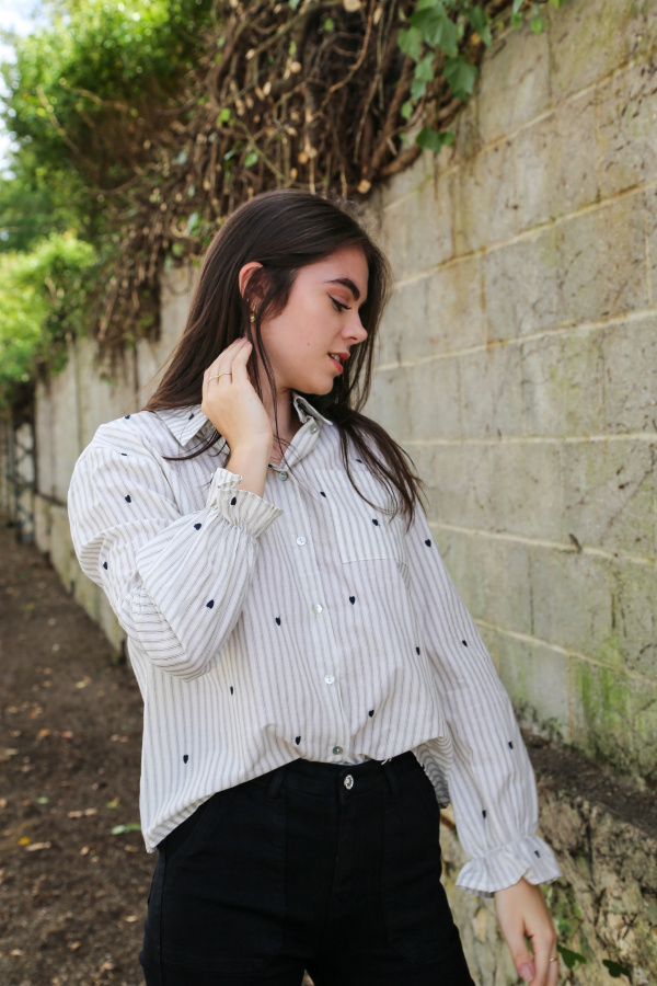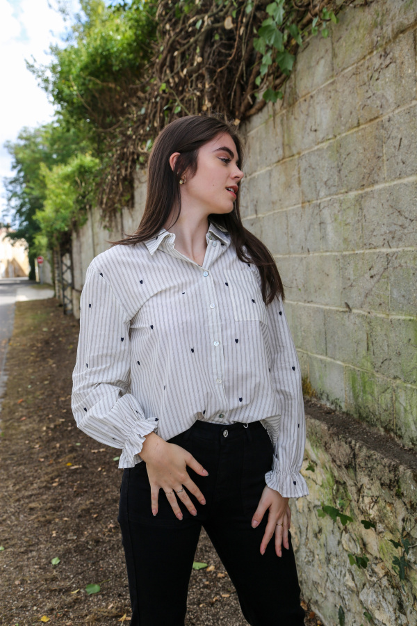 Un classique revisité avec tendresse : cette chemise à manches longues mêle l’élégance intemporelle des rayures à la délicatesse de petits cœurs brodés, pour un look à la fois chic et plein de charme.