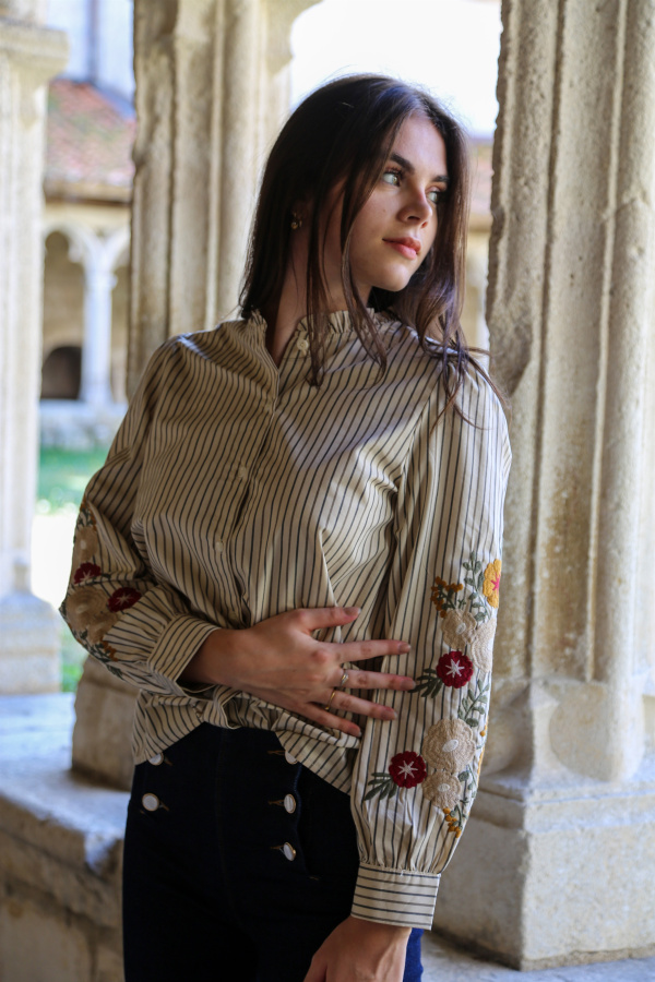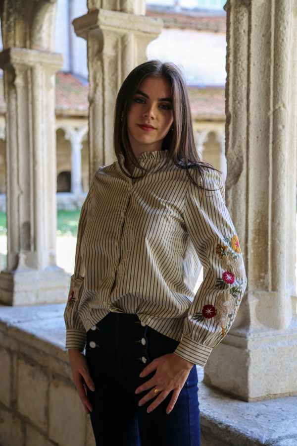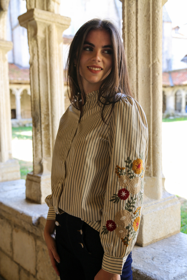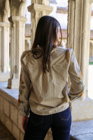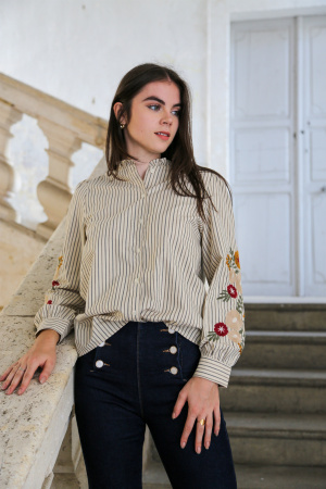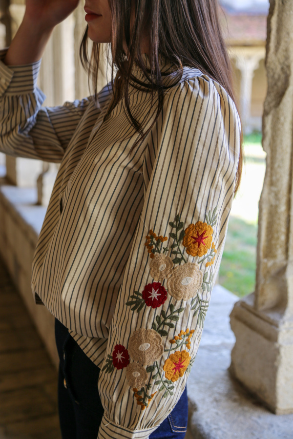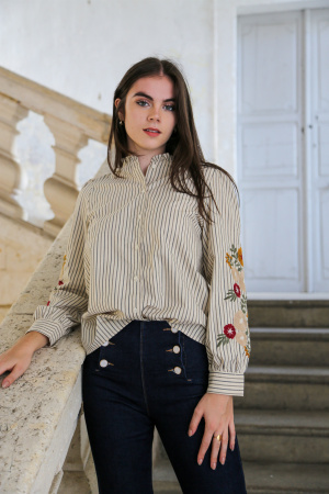 Mettez une touche de fraîcheur dans votre dressing avec cette chemise à manches longues au motif rayé, rehaussée de délicates broderies florales. Son col rond lui donne une allure douce et féminine, parfaite pour la mi-saison.